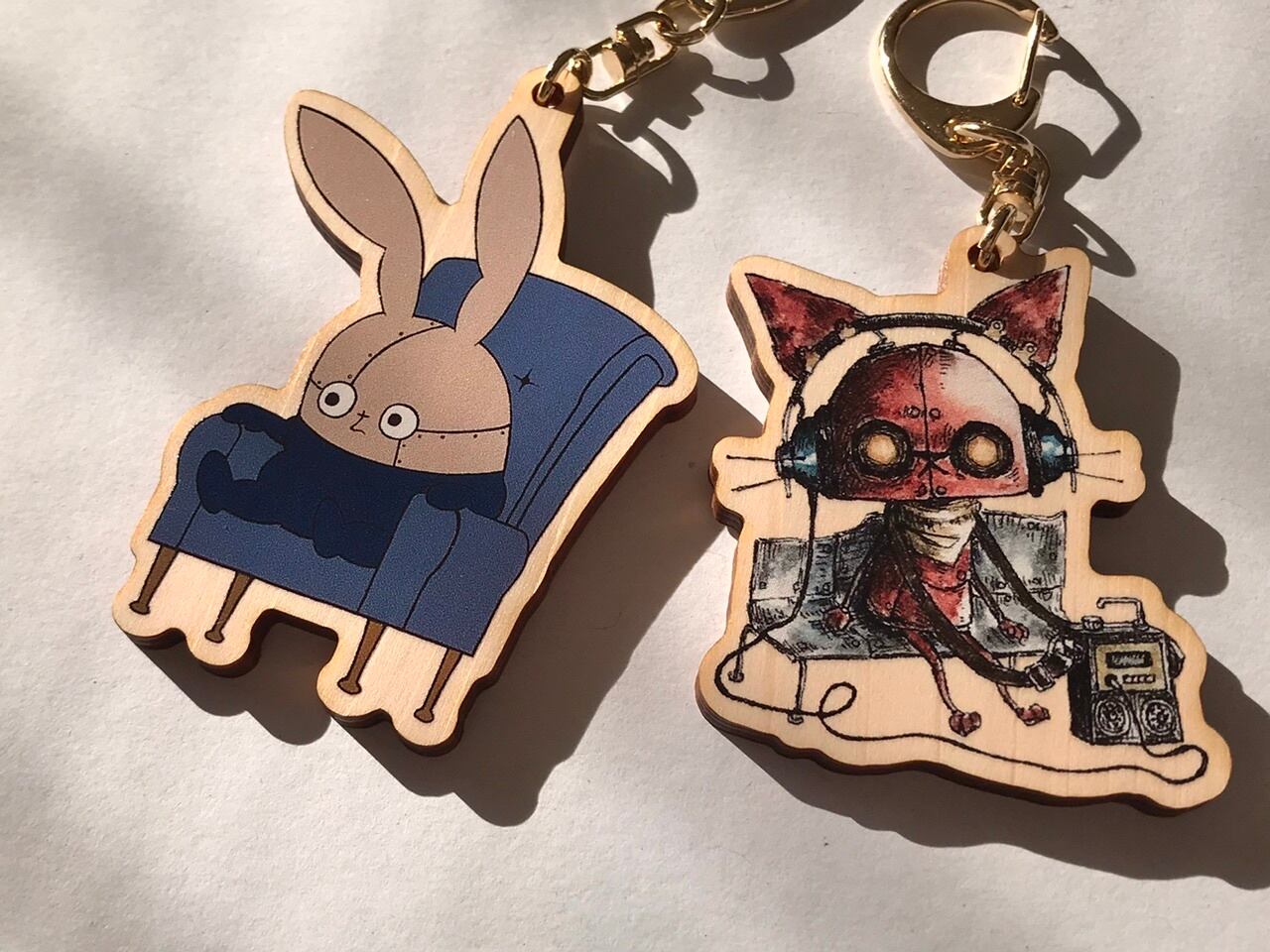 アクリル作品のウサギと水彩、ペン画の猫のウッドキーホルダー。